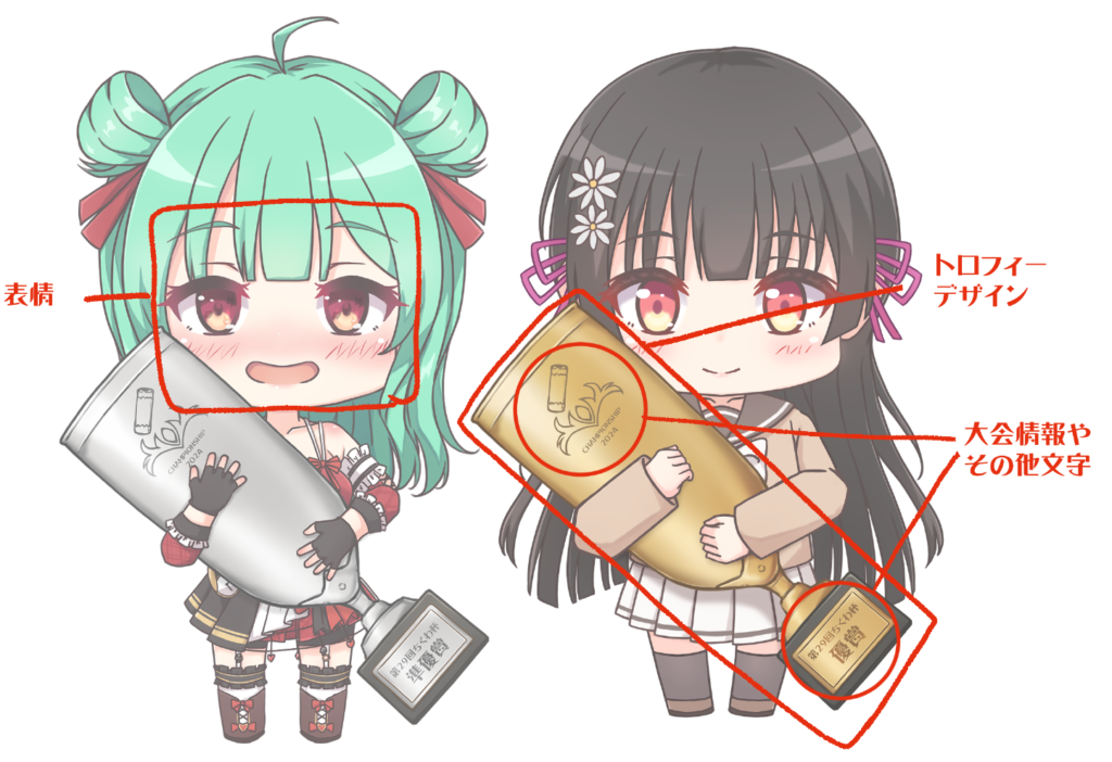 大会開催→入賞者決定しましたら順位とキャラなどご連絡ください(こちらで入賞者様へご連絡対応も可能です)→内容確認後3~4週間目安で作成しお渡し予定